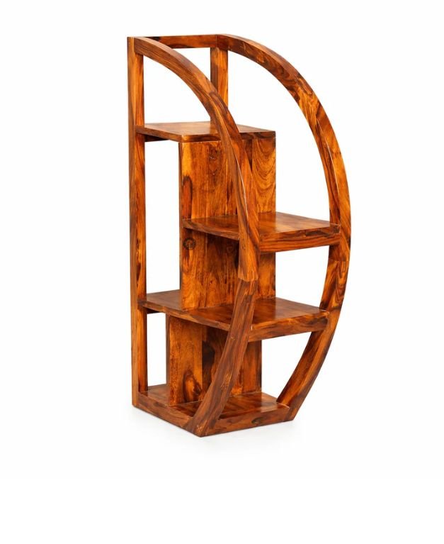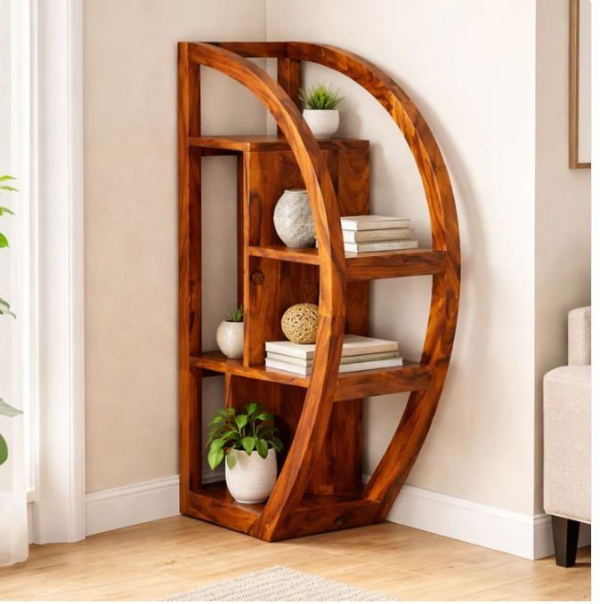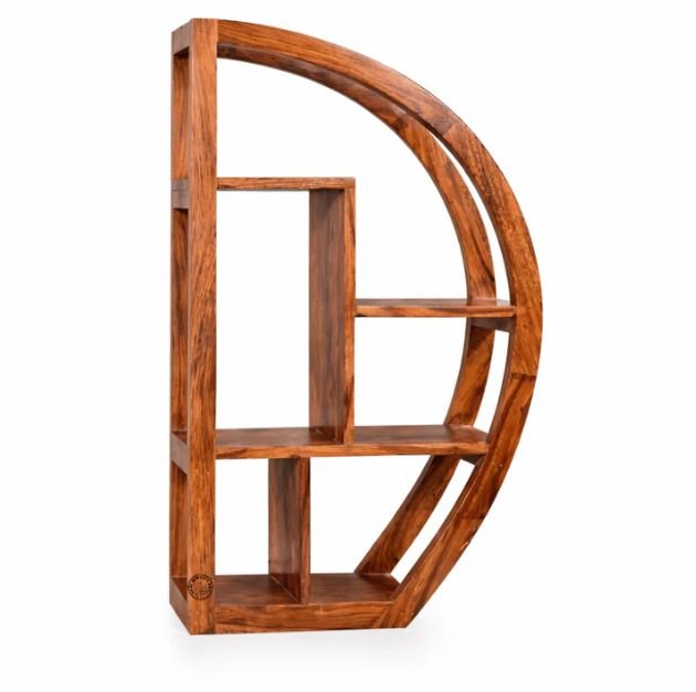 ​This architectural display unit is a stunning example of how Nilambur teak can be transformed into functional art. Featuring a distinctive semi-circular “D” or crescent moon shape, this shelving unit balances geometric precision with the natural, warm soul of Kerala’s finest timber. The rich, varied grain of the teak wood provides an organic backdrop for your most cherished collectibles.