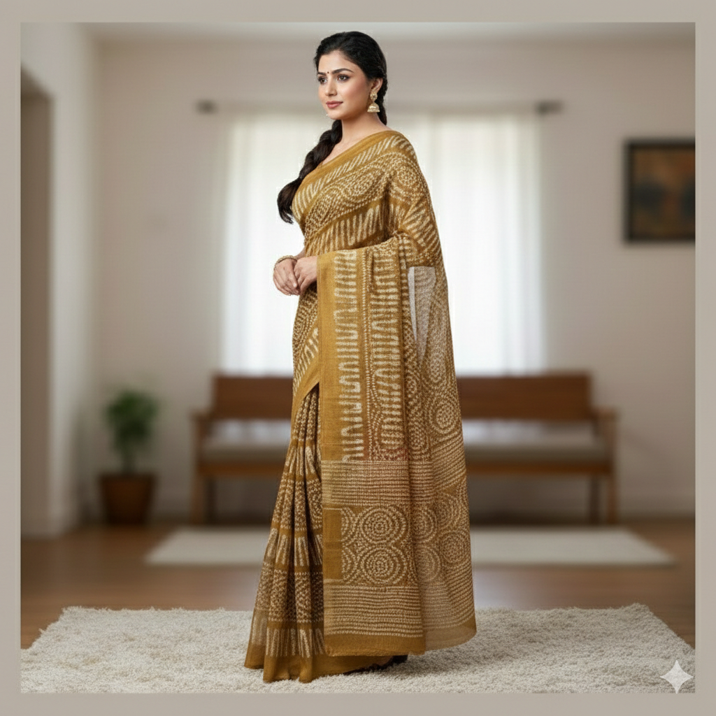 Elevate your ethnic wardrobe with this timeless Mustard Gold Cotton Mul Saree. Perfectly blending traditional craftsmanship with contemporary elegance, this saree features intricate hand-block printed geometric and circular motifs (Bandhani-inspired) in a contrasting ivory white.
