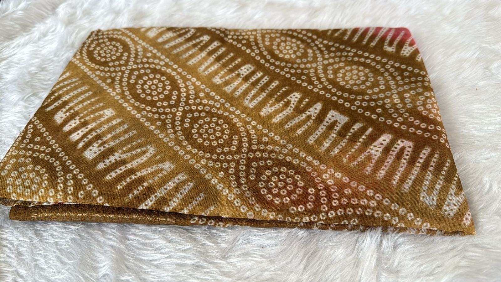 Design: Traditional hand-block printing featuring geometric textures and Bandhani-style circles.