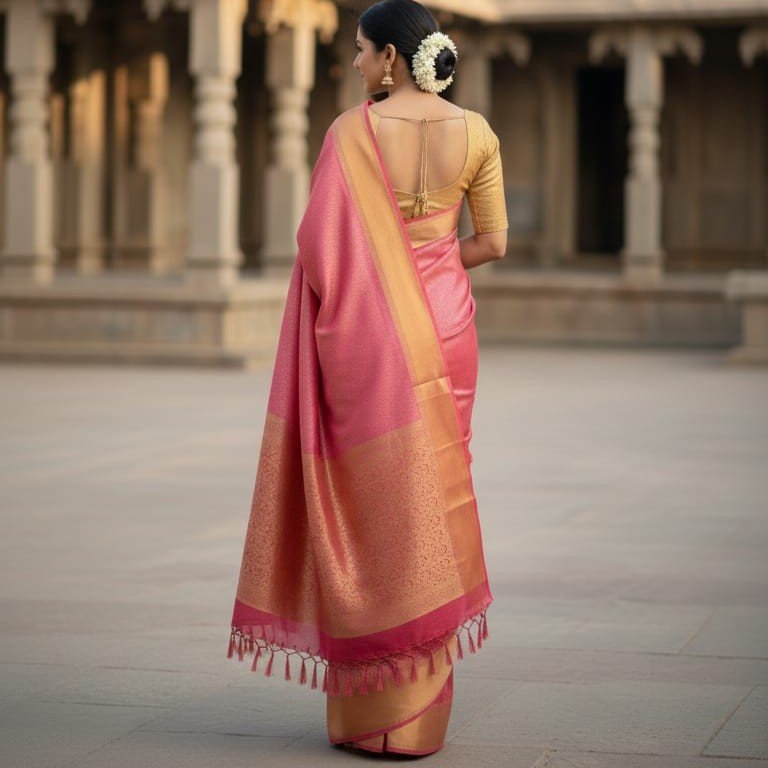 Pallu: Rich gold zari work with matching tassels.