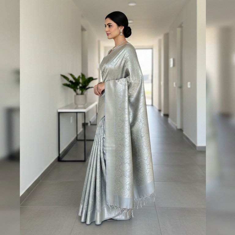 Step into the spotlight with this ethereal silver-grey saree, a perfect blend of traditional weaving and contemporary color palettes. This piece features a tone-on-tone design where the entire body is covered in a rich, intricate silver zari floral jaal (lattice), giving it a metallic, high-fashion sheen that catches the light beautifully.