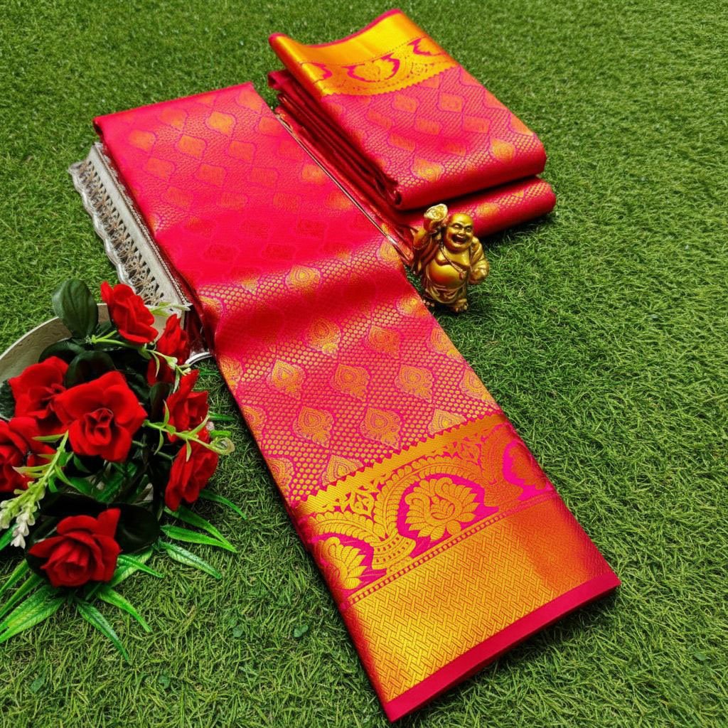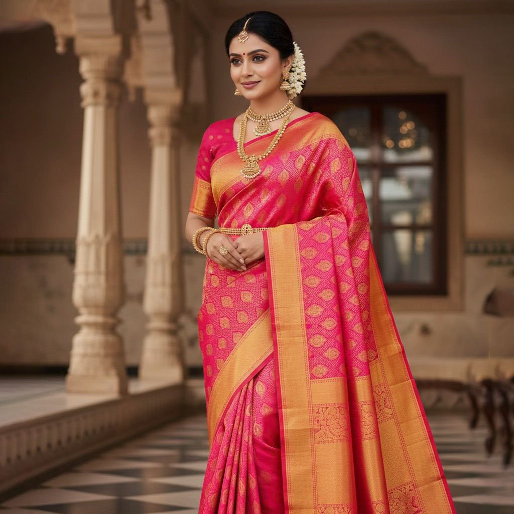 Vibrant rani pink soft silk saree with all-over gold zari butta and rich traditional pallu, perfect for weddings and festive functions.