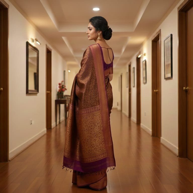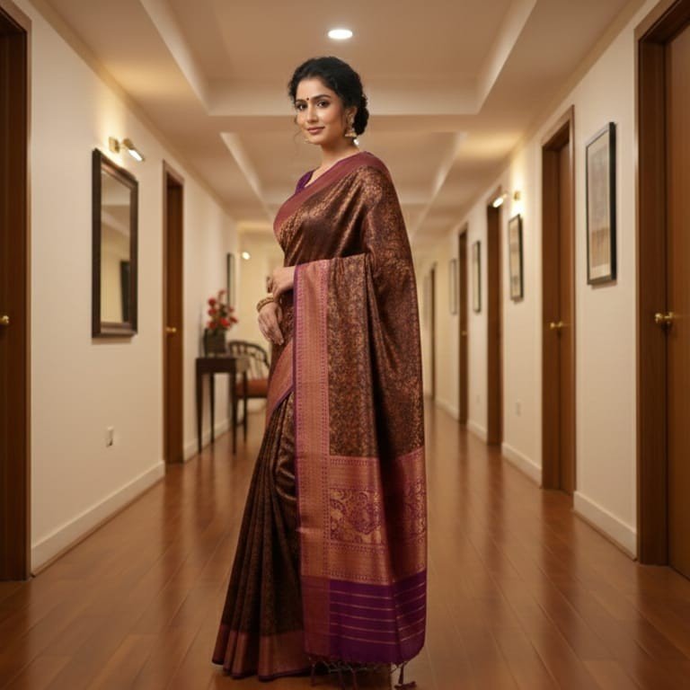 Exude unmatched sophistication in this deep Chocolate Brown and Plum silk saree. The rich, dark tones combined with heavy gold zari work create a high-contrast, luxurious look that is sure to turn heads at any evening event.