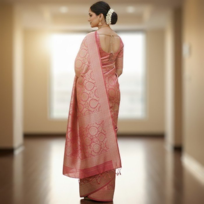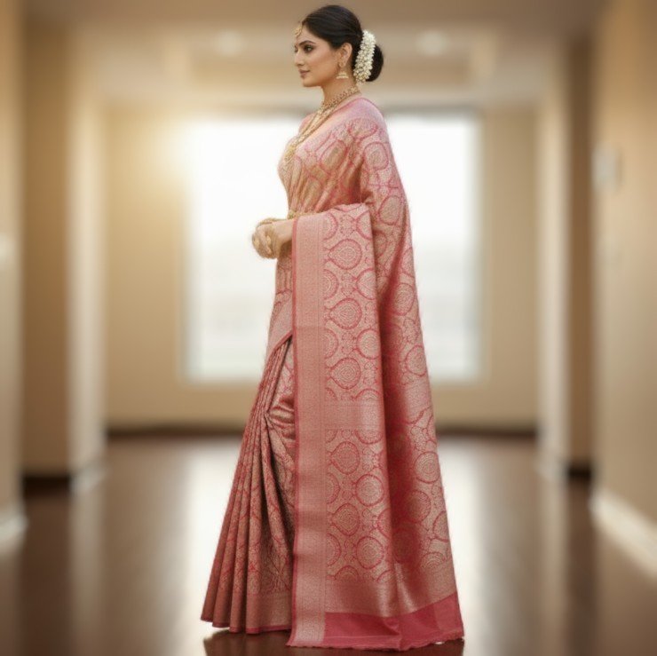 Exude timeless elegance with this exquisite Rose-Pink Banarasi Silk Saree, a masterpiece of traditional Indian weaving. Crafted from premium silk, this saree features a rich, lustrous texture that drapes beautifully, making it an ideal choice for weddings, festivals, and grand celebrations.