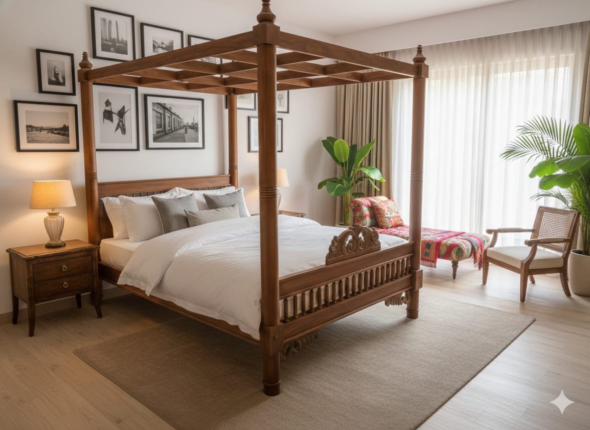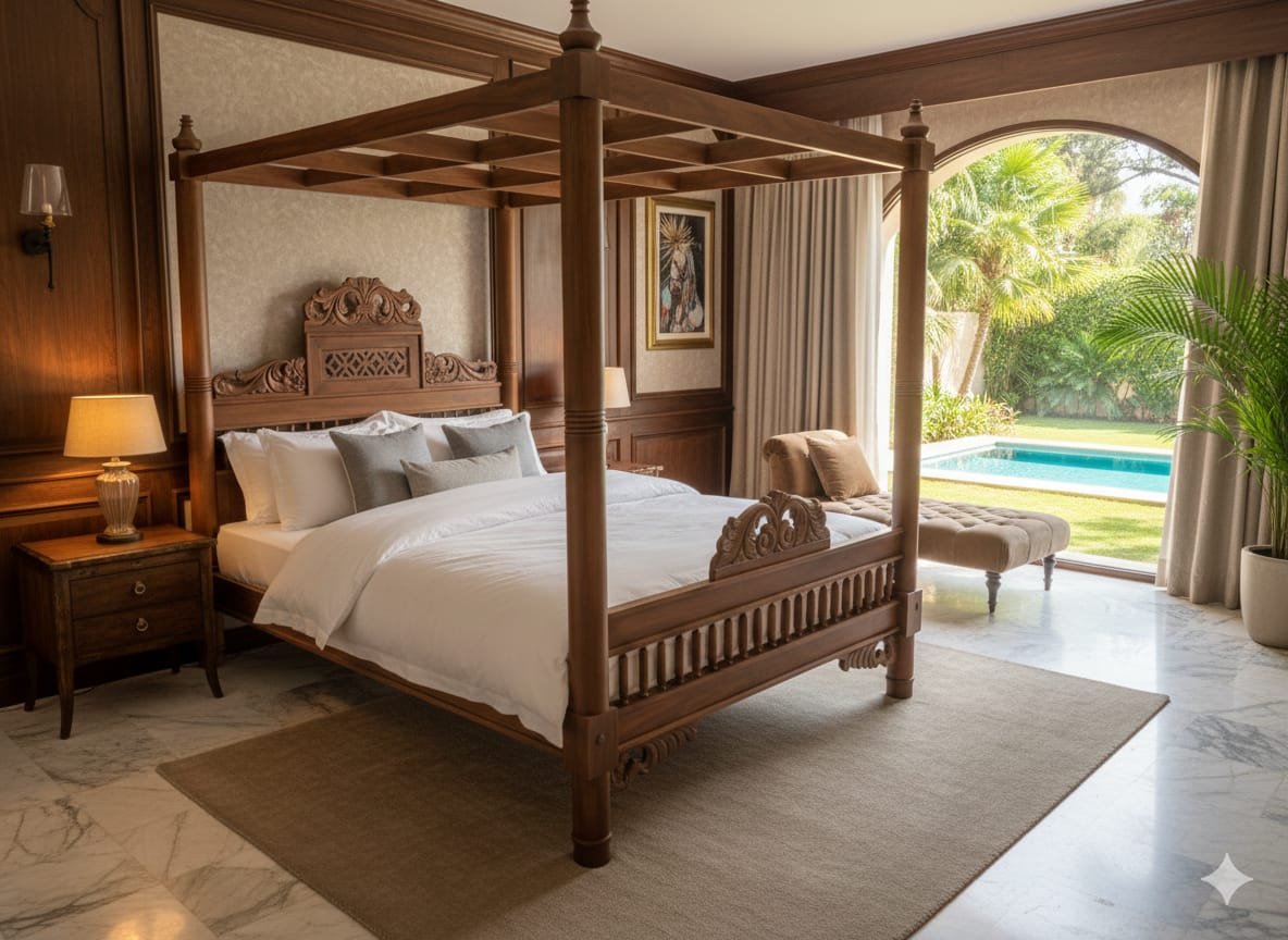 Royal Hand-Carved Teak Wood Four-Poster Bed