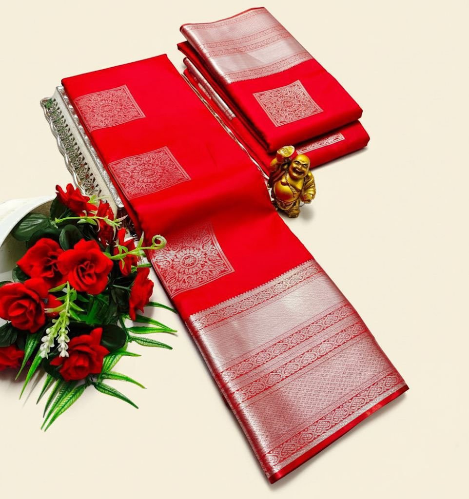 Vibrant ruby red soft silk saree with bold silver zari box motifs and a richly woven silver border, perfect for festive and wedding wear.