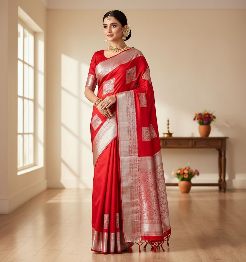This striking ruby red saree combines bold traditional design with a clean, modern festive finish. The body is adorned with large silver zari box motifs featuring intricate mandala-style detailing, spaced evenly to create a premium, balanced look.