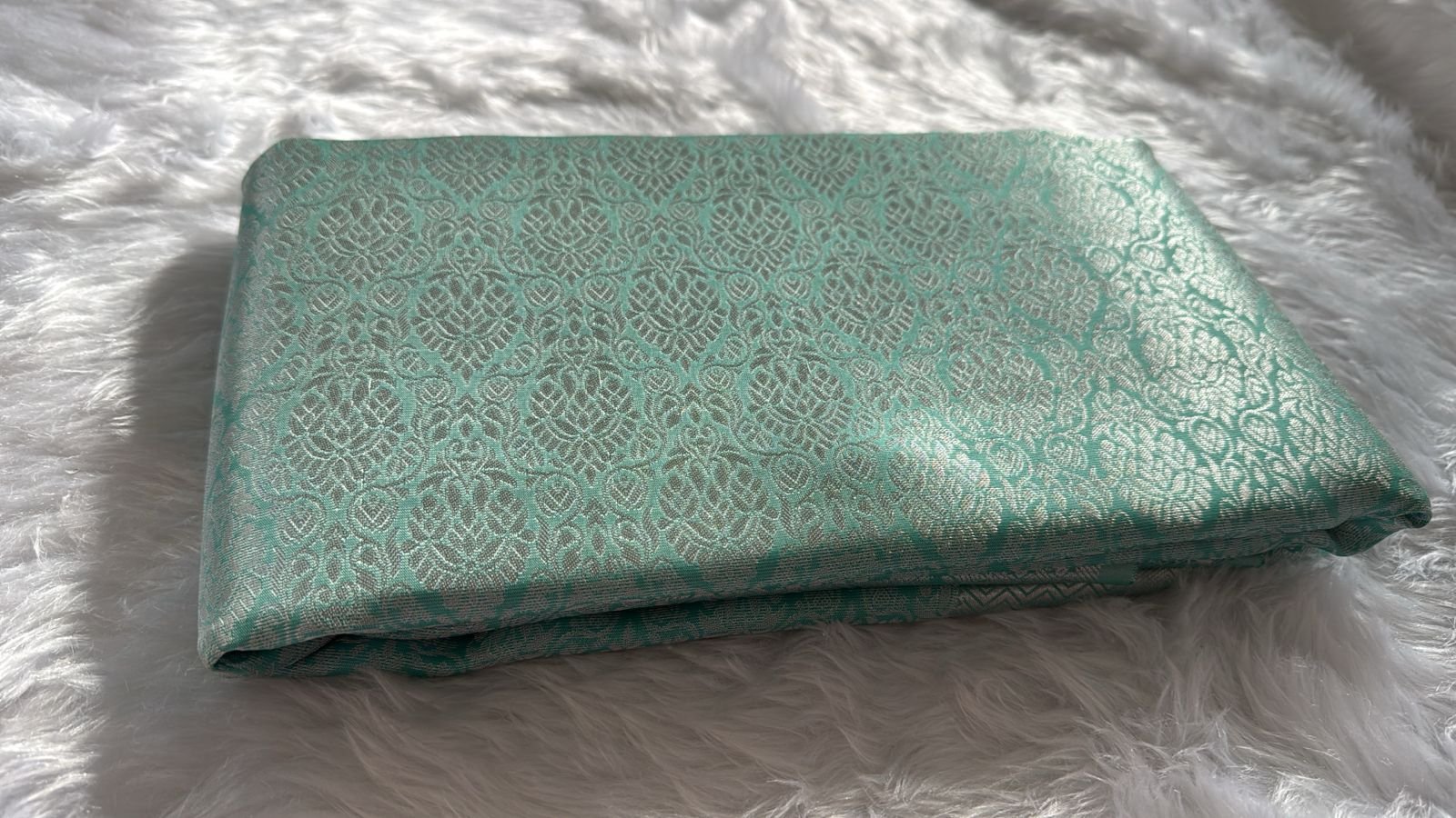 Elevate your ethnic wardrobe with this exquisite Seafoam Green Silk Saree. Crafted for those who appreciate timeless elegance, this saree features a rich, all-over brocade pattern intricately woven with shimmering silver zari. The soft, pastel mint hue combined with the metallic sheen makes it a perfect choice for weddings, festive celebrations, or high-end evening events.