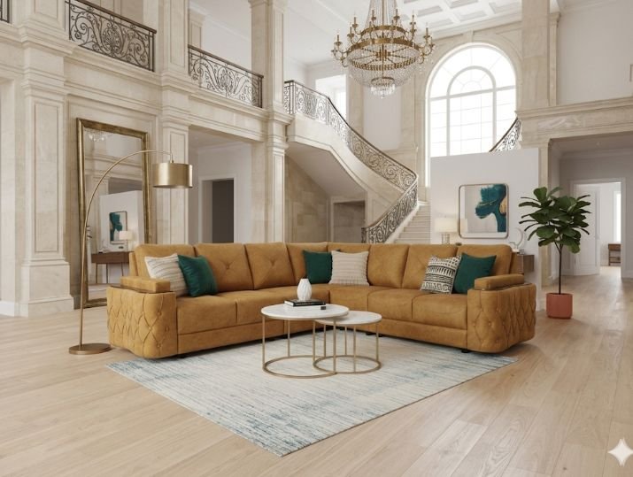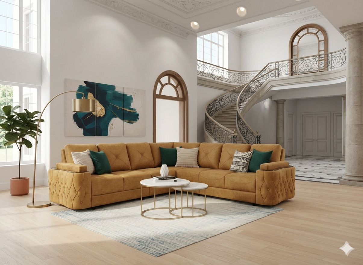 ​This premium L-shaped sectional sofa is a masterpiece of craftsmanship, blending the timeless strength of Nilambur Teak with contemporary luxury. Sourced from the world-renowned forests of Kerala, Nilambur teak is celebrated for its rich golden-brown hue, exceptional durability, and natural resistance to decay, making this sofa an heirloom-quality investment for your home.