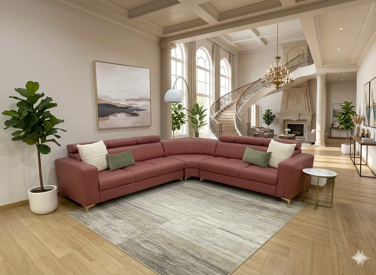 ​Elevate your living space with this statement L-shaped cushion sofa, designed for those who value both bold aesthetics and supreme relaxation. Featuring a sophisticated rose-hued upholstery, this sectional combines modern clean lines with intricate textural details to create a focal point that is as comfortable as it is stylish.