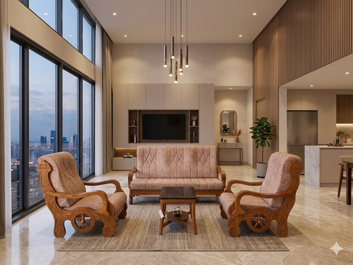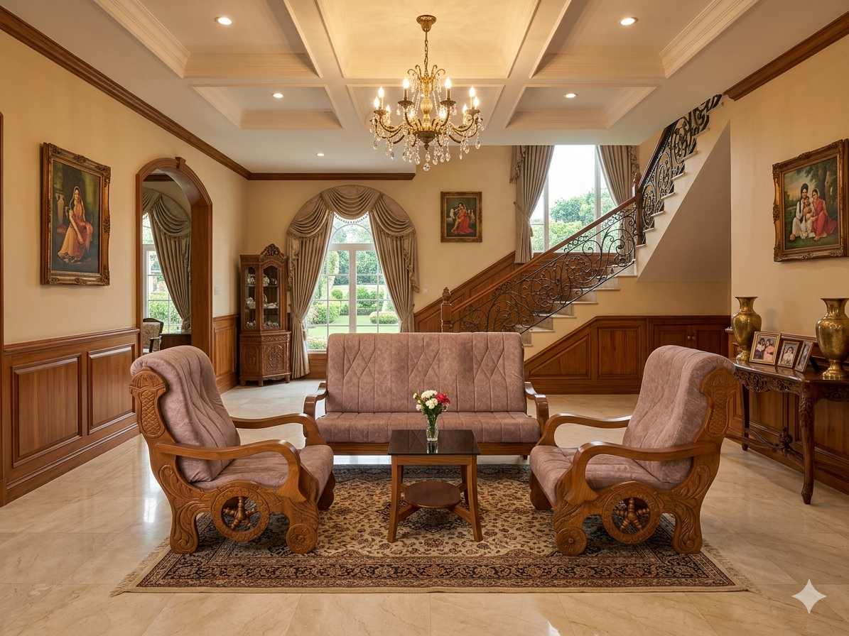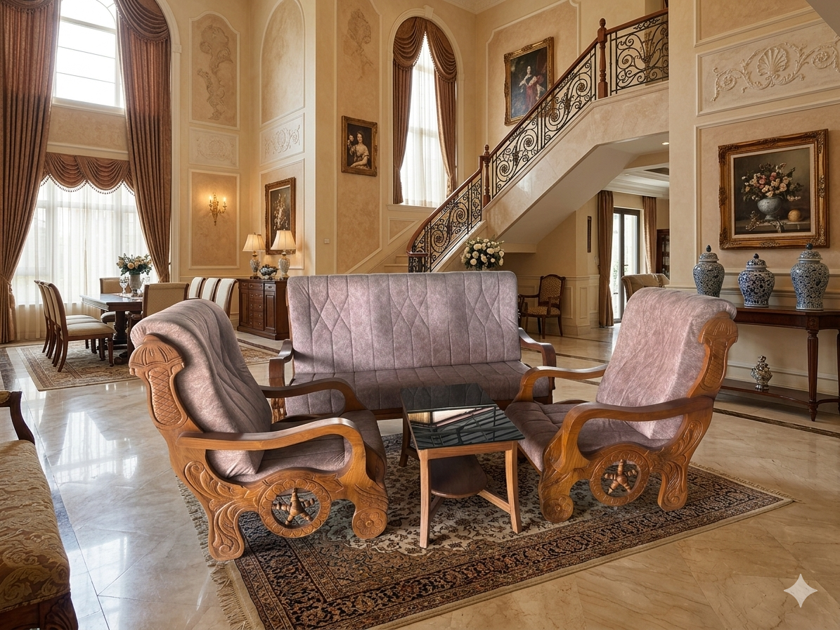 Introduce a piece of legendary Kerala heritage into your home with this exquisitely carved Nilambur Teak Wood Sofa Set. This design is a tribute to traditional Indian craftsmanship, featuring the iconic “Chariot Wheel” motif, all rendered in the world’s most sought-after teak wood.