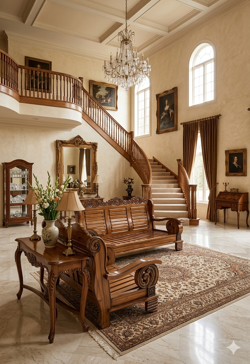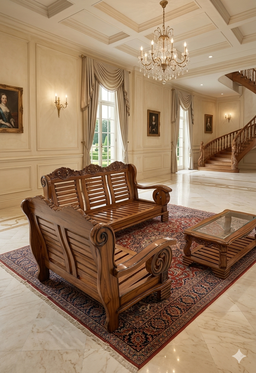 Embrace the peak of luxury with this Nilambur Teak Wood Sofa Set, a masterpiece that showcases the incredible grain beauty and structural strength of Kerala’s legendary timber. This set features a high-gloss finish and dramatic architectural lines, making it a definitive heritage piece for any home.