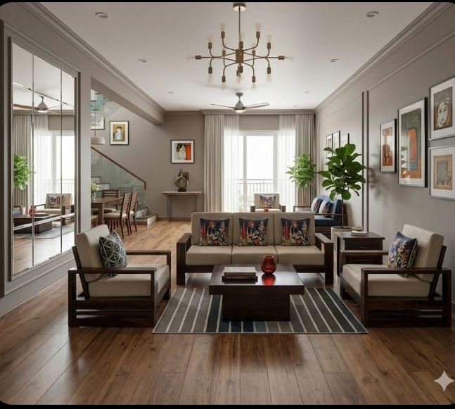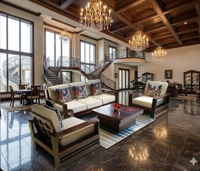 This living room ensemble showcases the darker, more dramatic side of Nilambur Teak, treated with a rich walnut-tinted polish that emphasizes its dense, world-class grain. Often referred to as the “King of Timbers,” Nilambur teak is sought after for its exceptional dimensional stability and the natural oils that make it nearly impervious to the elements.