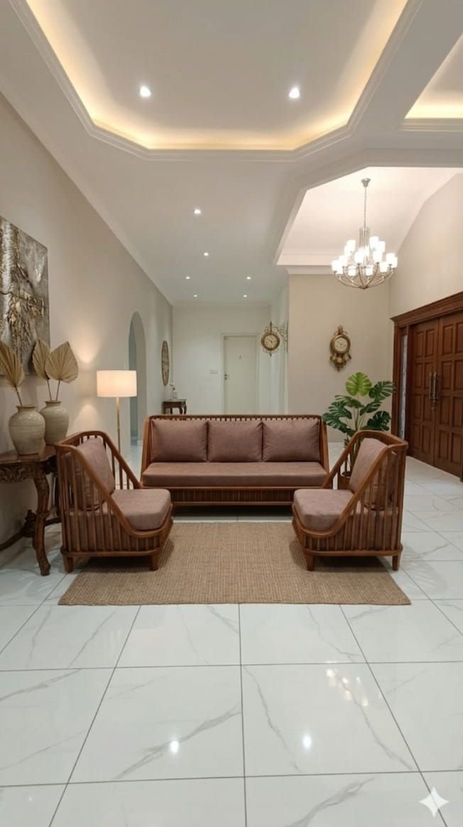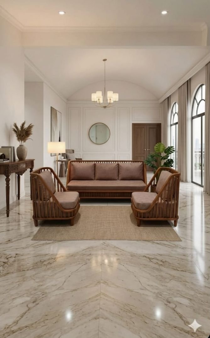 This sofa set is a masterclass in traditional craftsmanship, showcasing the golden-brown hues and superior grain patterns that make Nilambur Teak world-renowned. Sourced from the historic teak plantations of Kerala, this wood is celebrated for its exceptional durability and natural weather resistance.