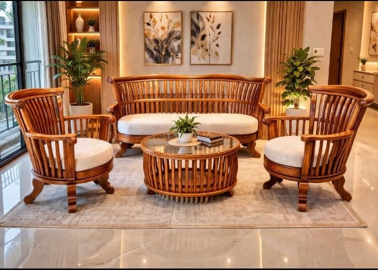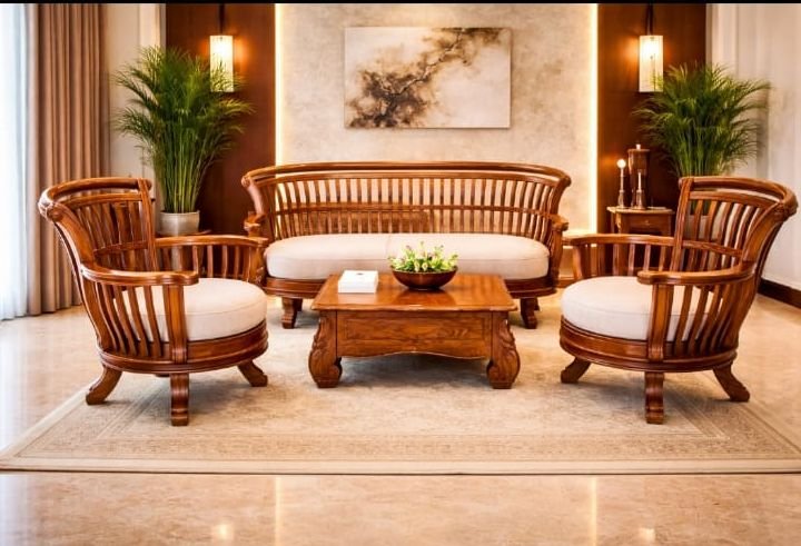 This sofa set exemplifies the grandeur of Kerala Nilambur Teak, often referred to as “The King of Timbers.” Sourced from the world’s oldest teak plantations, this wood is prized for its rich golden-brown luster and legendary durability, making it the gold standard for luxury furniture.