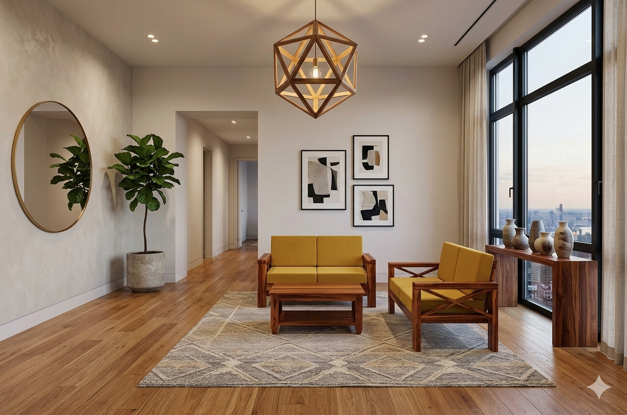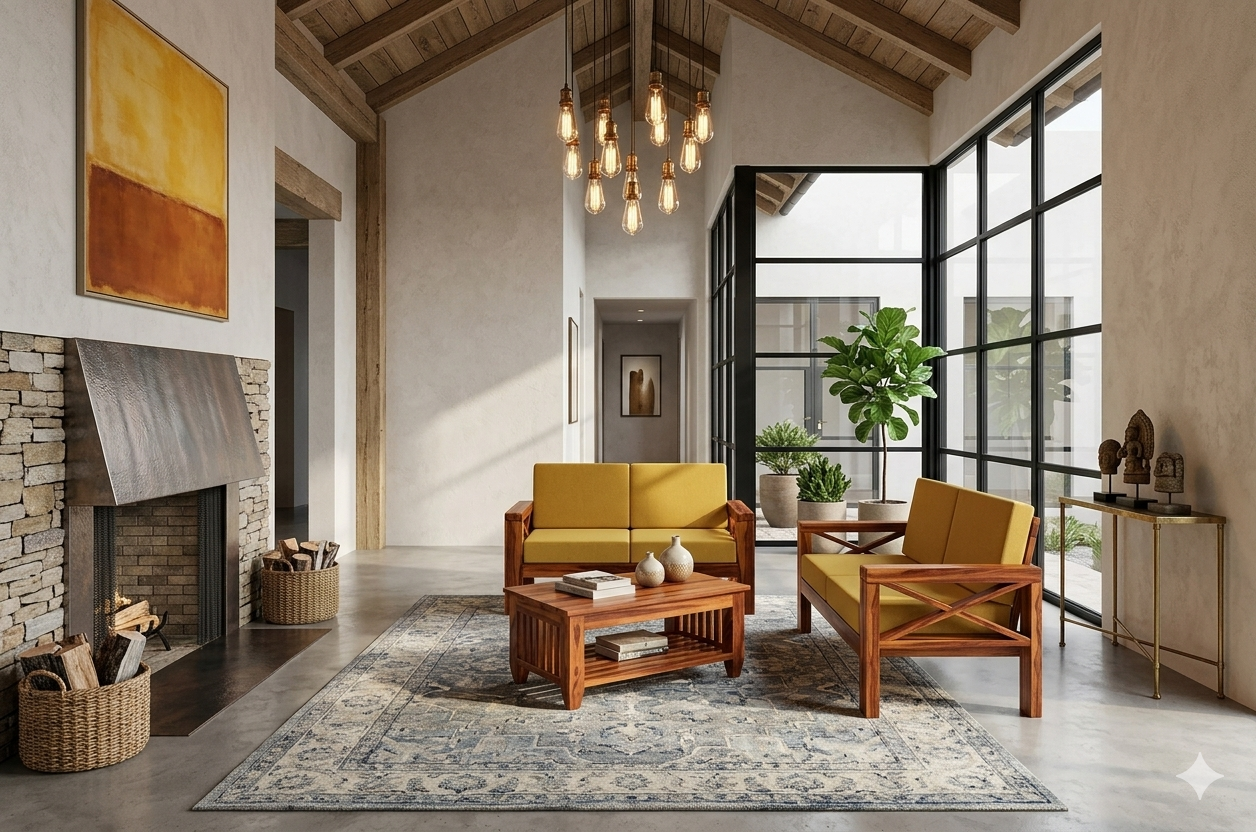This vibrant sofa ensemble showcases the exceptional quality of Kerala Nilambur teak wood, celebrated for its striking grain patterns and natural honey-gold finish. The set combines robust traditional joinery with a bold, contemporary color palette, making it a standout addition to any digital catalog or interior space.