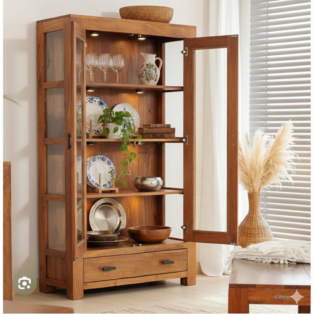 Solid Teak Wood 2-Door Display Gallery & Crockery Cabinet