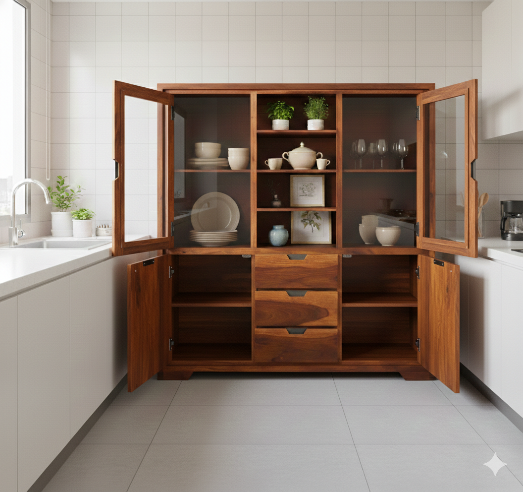 Solid Teak Wood Multi-Purpose Display Cabinet & Crockery Unit