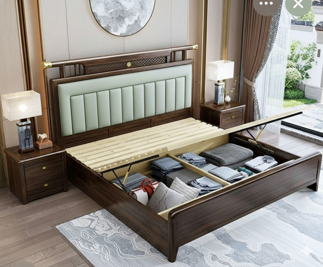 Upgrade your bedroom with this elegant and highly functional modern-oriental style bed. Crafted from premium dark-toned solid wood, this piece blends timeless aesthetics with clever, space-saving technology.