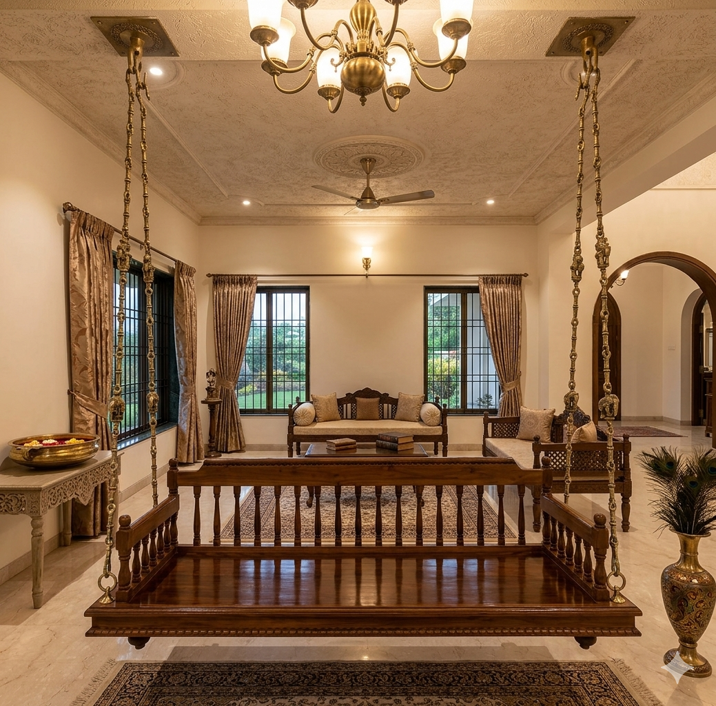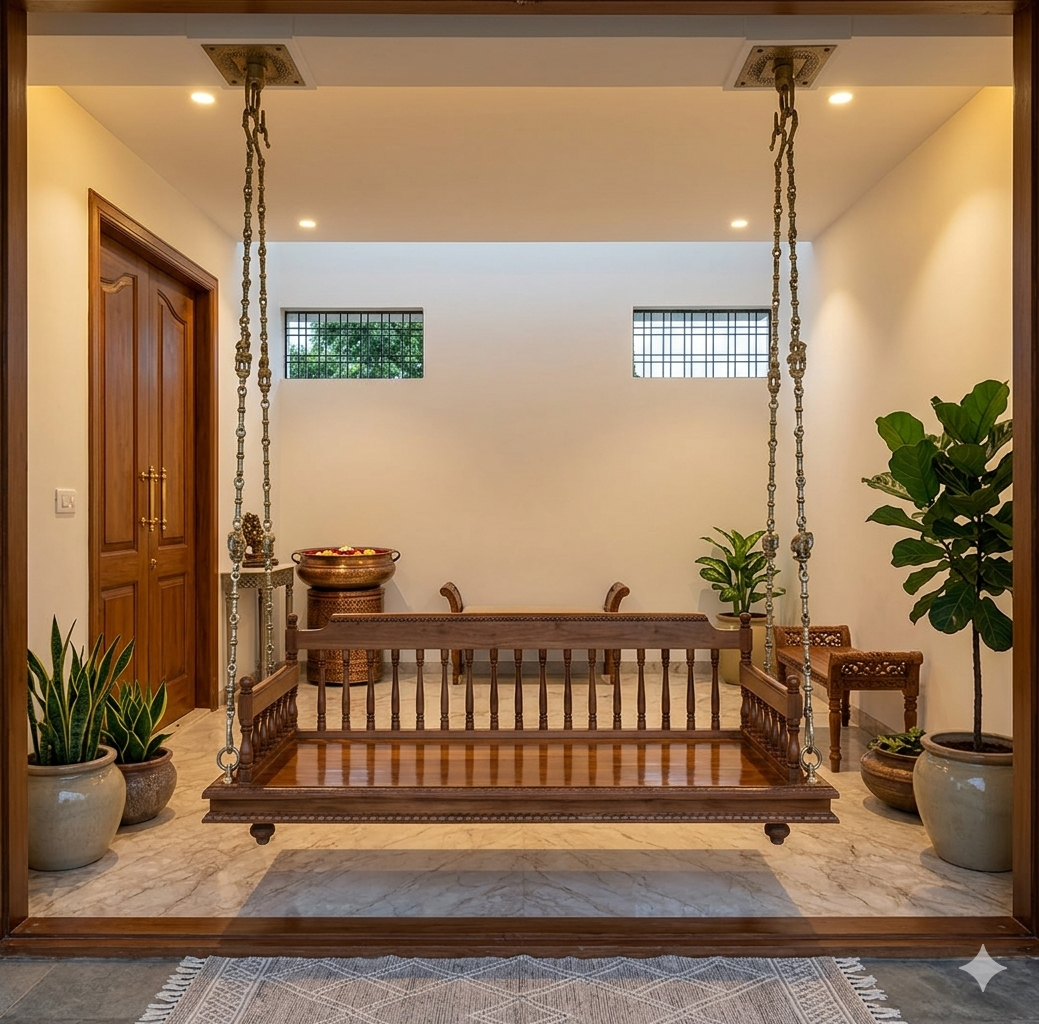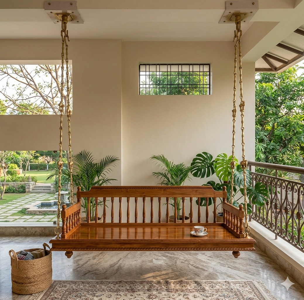 Infuse your home with the rhythmic grace of a traditional Kerala household with this Nilambur Teak Spindle-Back Swing. This piece celebrates the “Golden Timber” of Malabar, featuring a timeless design that balances intricate detailing with robust structural integrity.