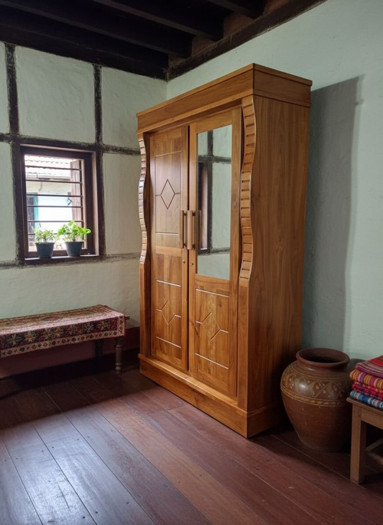 This two-door teak wood wardrobe blends strength, craftsmanship, and timeless design. Made from solid Kerala teak wood or a premium Burma-teak finish, it features natural grain patterns and a sturdy, well-balanced structure.