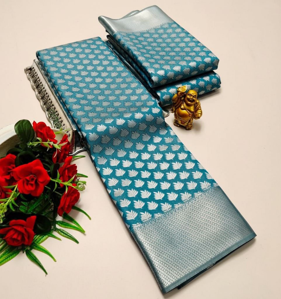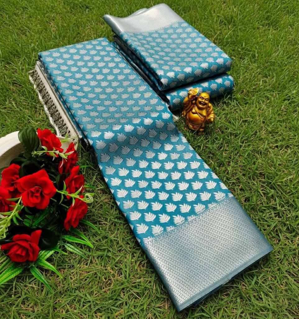 Teal Blue Soft Silk Saree with Silver Jacquard Leaf Motifs