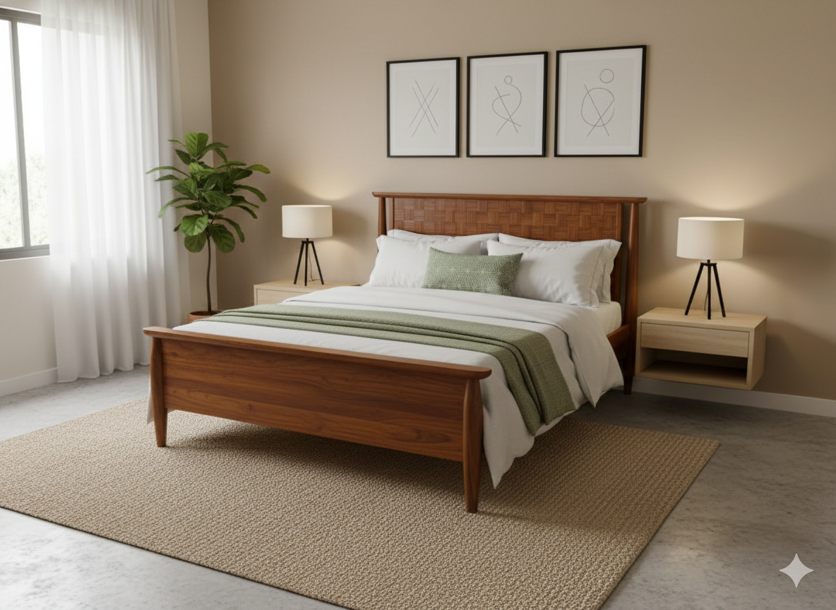 The standout feature is the intricately woven headboard, showcasing a “basket-weave” woodwork pattern that adds depth and an artisanal touch to your space. With its warm honey-amber finish and elegant tapered spindle legs, this cot brings a sophisticated “Villa” aesthetic to any modern apartment or luxury home.