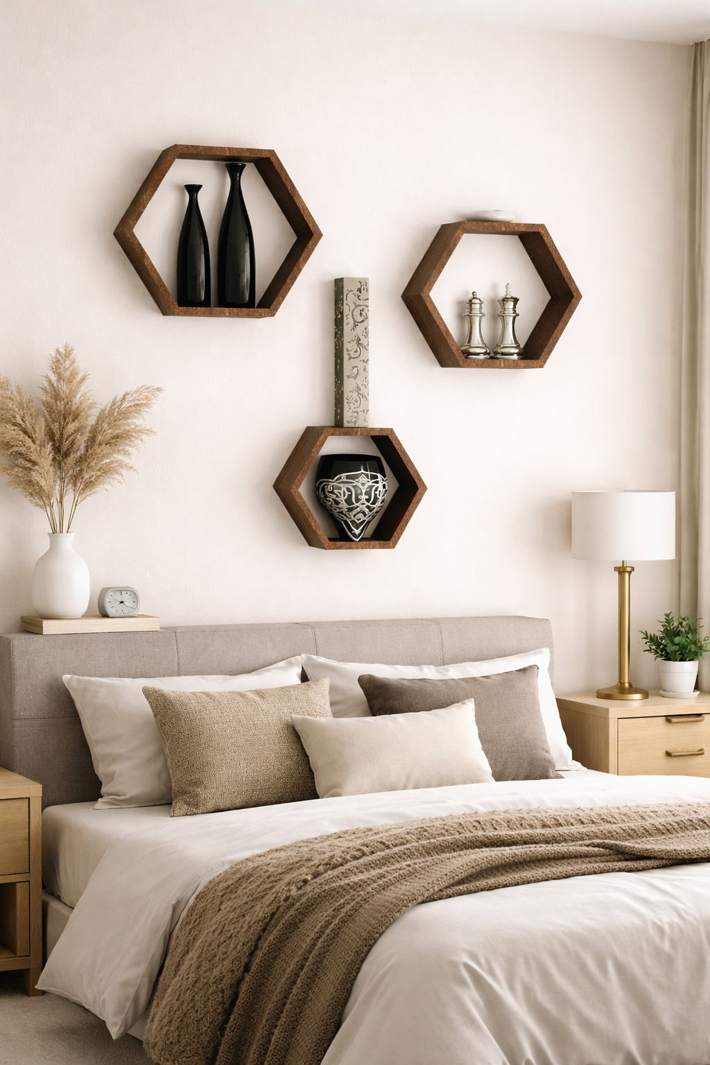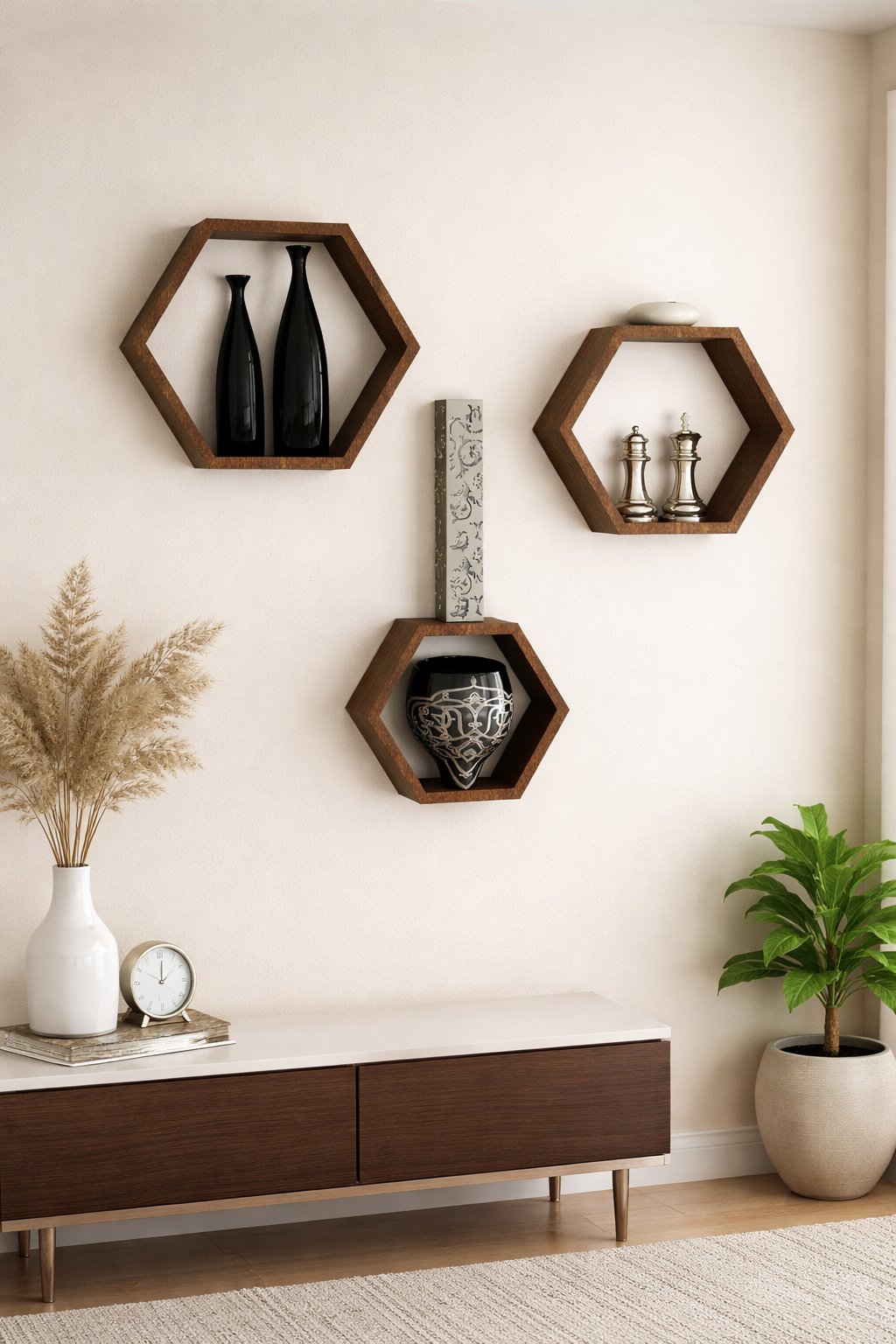 Nilambur Teak Wood, world-renowned for its superior quality and rich golden-brown hue. These hexagonal floating shelves bring a touch of Kerala’s traditional craftsmanship into a modern apartment setting.