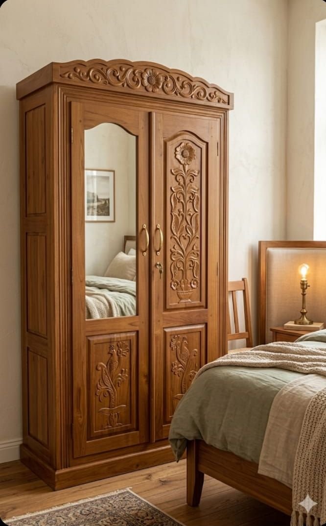 This exquisite wardrobe is a testament to timeless Kerala craftsmanship, meticulously carved from authentic Nilambur Teak. Known globally as the “Home of Teak,” Nilambur produces wood with a unique golden-brown hue and exceptional durability that only improves with age.